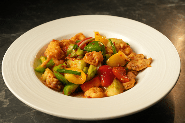 Espagnole Sauce Tossed with Boneless Mutton, Bell Peppers & Onion